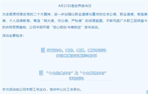 4月21日至5月24日,公司本部工會按照“全員參與、注重實效”的原則,組織開展了“悅心規劃·書香航空”讀書分享活動。